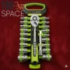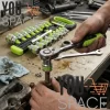 Llave Chicharra (Ratchet) Reversible: El kit incluye una chicharra de 1/2″ con un mecanismo interno robusto. Cuenta con una palanca de inversión para cambiar rápidamente la dirección de giro (apretar o aflojar) sin necesidad de quitar la herramienta de la tuerca o perno. El mango tiene un diseño ergonómico de color verde y negro para un agarre cómodo y seguro.