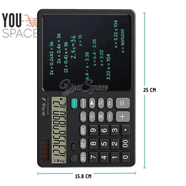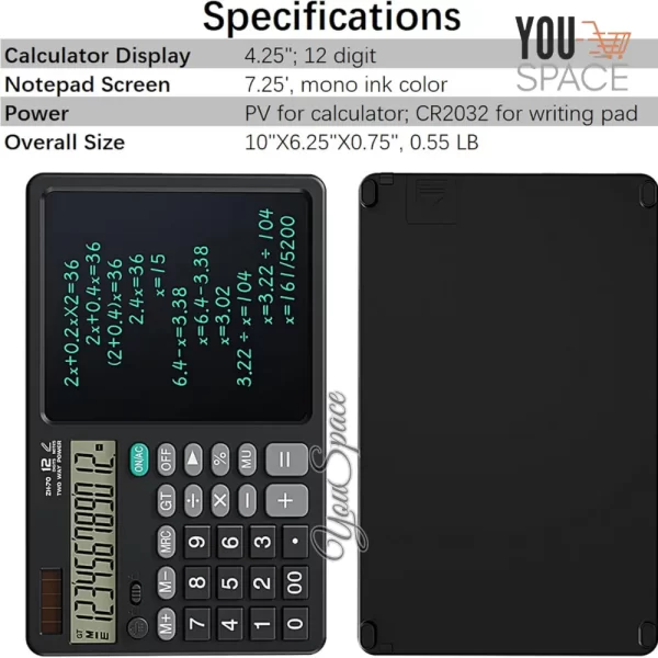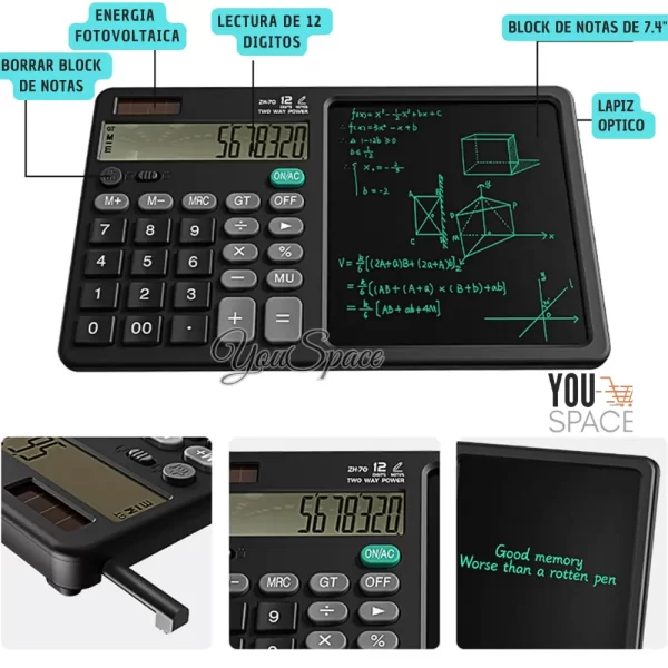 - Doble funcionalidad: Integra una calculadora de funciones estándar y un bloc de notas digital en un diseño plegable y portátil.