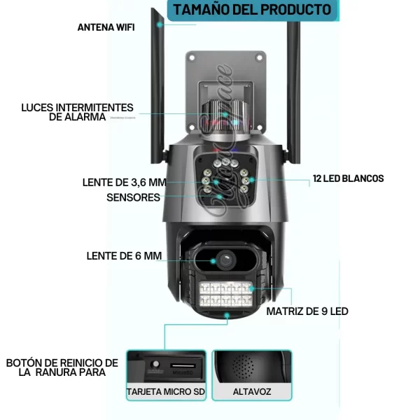 - Visión nocturna: Cuenta con visión nocturna, que puede incluir LEDs infrarrojos para modo discreto o LEDs de luz blanca para visión a color por la noche y función de alarma con luz.