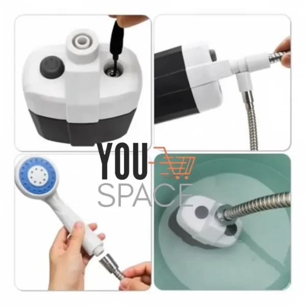 Succión y Descarga de Agua: La bomba sumergible succiona agua de cualquier recipiente (cubo, lavabo, etc.) a una tasa de 4-5 litros por minuto, y la descarga a través del cabezal de ducha.