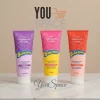 Los exfoliantes corporales en crema Bubbaluu están disponibles en tres aromas: uva (envase morado), tutti frutti (envase rosa/amarillo) y frutilla (envase naranja/melocotón). Cada uno ofrece beneficios y características similares con un toque de fragancia único.