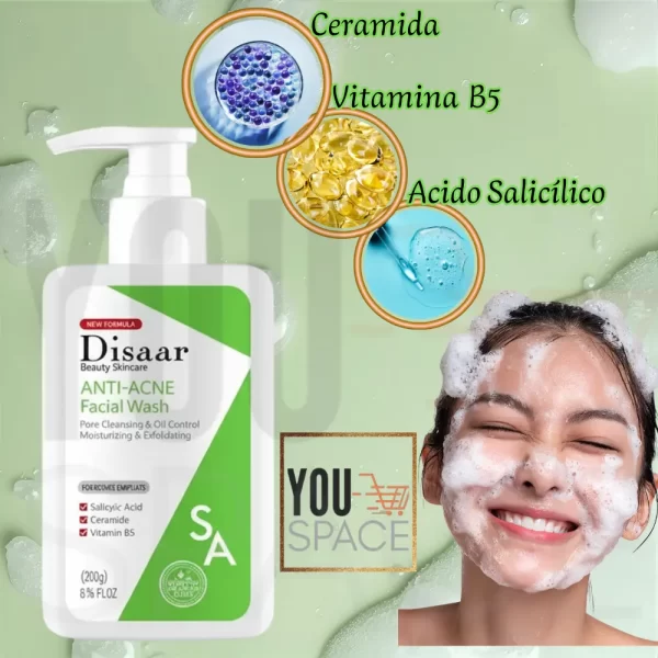 Disaar Anti-Acne Facial Wash: Este jabón facial está diseñado para una limpieza profunda, controlando el exceso de grasa y la suciedad que pueden obstruir los poros. Contiene ingredientes como ácido salicílico y ceramidas que ayudan a hidratar la piel y prevenir la resequedad.