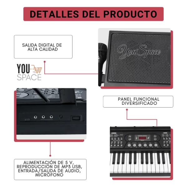 - Conectividad: Interfaz MIDI (algunos modelos), entrada de micrófono, salida de audio (auriculares).