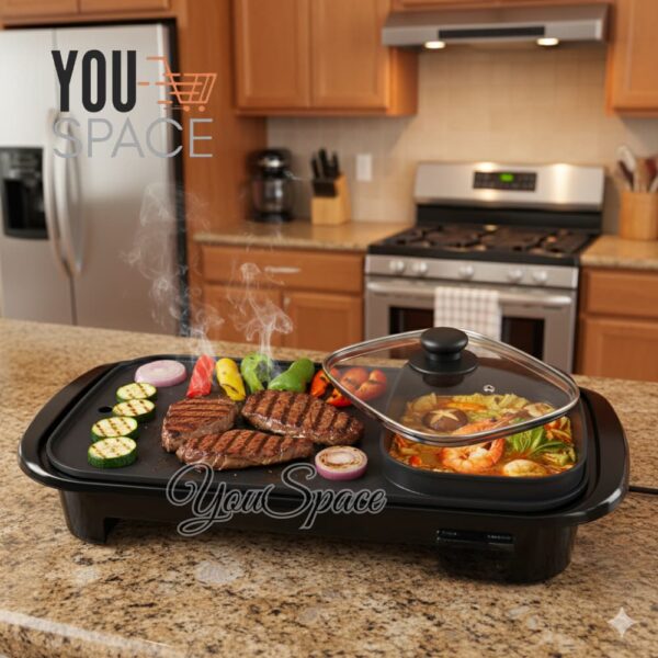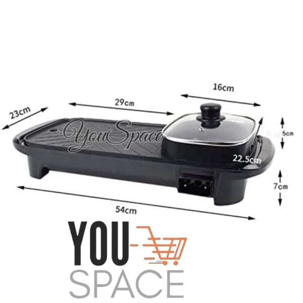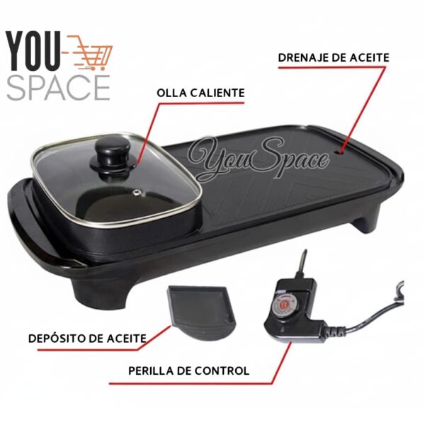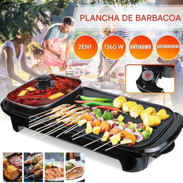 - Tipo: Parrilla eléctrica multifuncional 2 en 1 (plancha y olla caliente).