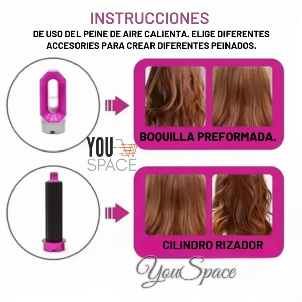 Si quieres desenredar tu cabello, alisarlo o crear rizos hermosos, nuestro secador de pelo Comb de aire caliente cinco en uno es la herramienta de moldeado perfecta para ti. Su diseño versátil y sus materiales de alta calidad lo hacen adecuado para su uso en casa, en salones o mientras viaja. Gracias a su tamaño compacto y su construcción ligera, podrá obtener resultados profesionales allá donde vaya.