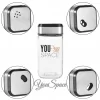 - Dos saleros/pimenteros cuadrados más pequeños de vidrio transparente con tapas de acero inoxidable y detalles en azul.