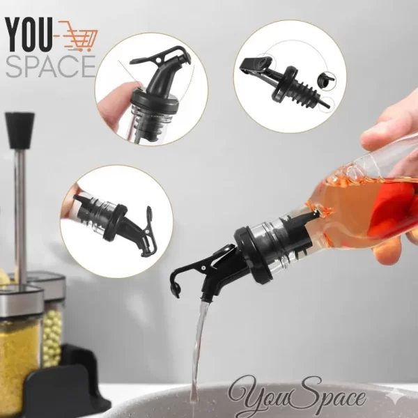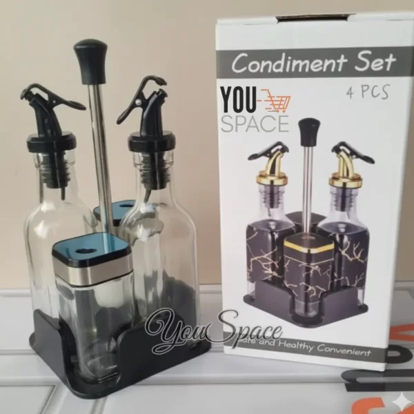 - Dos botellas altas de vidrio transparente con picos dosificadores negros y plateados/dorados, probablemente para aceite y vinagre.
