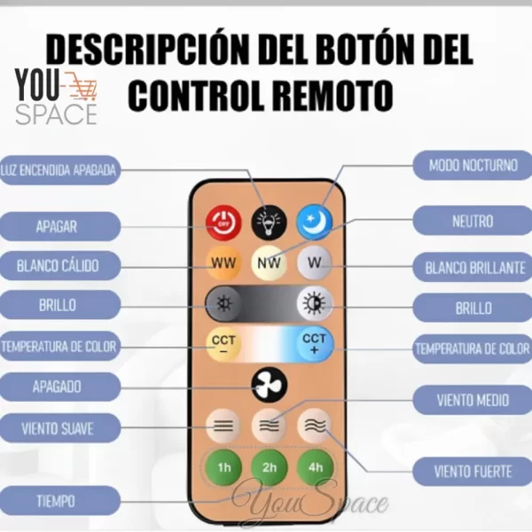 - Control: Incluye un control remoto para manejar las funciones de luz y ventilador.